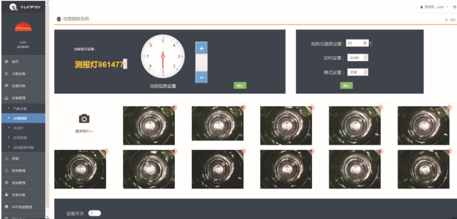 遠(yuǎn)程蟲情分析測報儀利用現(xiàn)代光、電、數(shù)控技術(shù),實現(xiàn)了在無人監(jiān)管的情況下,能自動完成誘蟲、殺蟲、收集、分裝、排水等系統(tǒng)作業(yè),通過GPRS移動無線網(wǎng)絡(luò),定時拍照采集接蟲盒內(nèi)收集的蟲體圖片,自動上傳到遠(yuǎn)程物聯(lián)網(wǎng)監(jiān)控平臺,平臺每天自動記錄采集數(shù)據(jù),形成蟲害數(shù)據(jù)庫,可以通過數(shù)據(jù)列表和圖表的形式展現(xiàn),工作人員可隨時遠(yuǎn)程了解以蟲體的情況和變化,制定防控措施。