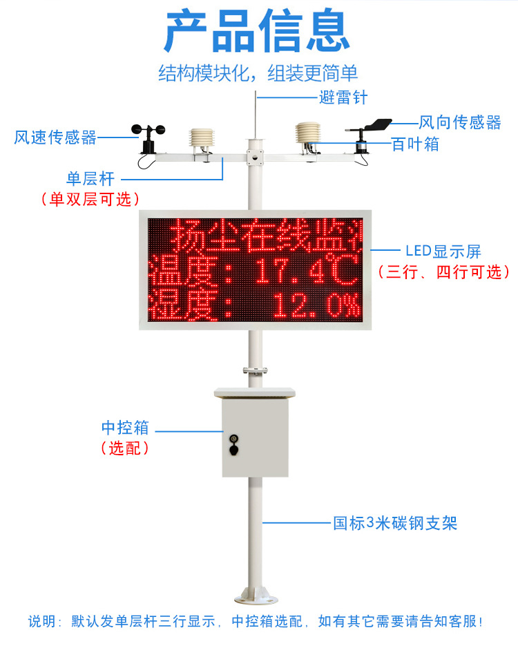 工地在線揚(yáng)塵監(jiān)測(cè)儀整體采用兩節(jié)式立桿式固定安裝,立桿可放置信號(hào)匯集柜,可固定戶外LED屏,方便室外任何環(huán)境安裝。